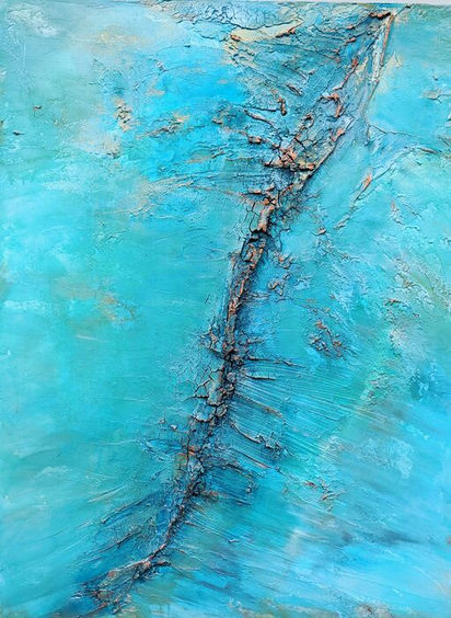 Deep hues of blues layered upon textures tipped with a contrasting copper colours and forms to stretch your imagination, what can you see?