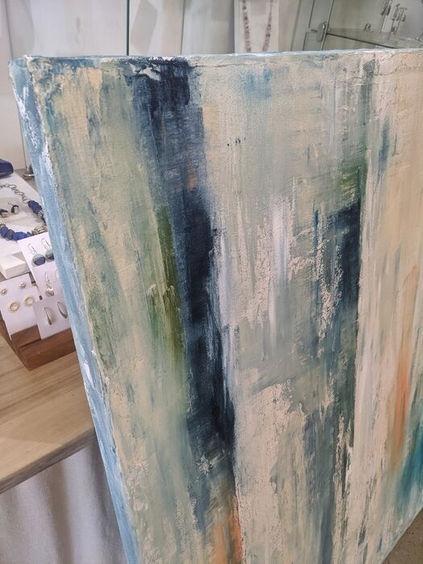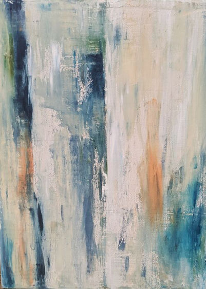 Muted blues beiges and a hint of apricot, this painting will go with a lot of decors. The texture is hard to see in a photograph but creates a depth that will please the viewer and compliment any space.